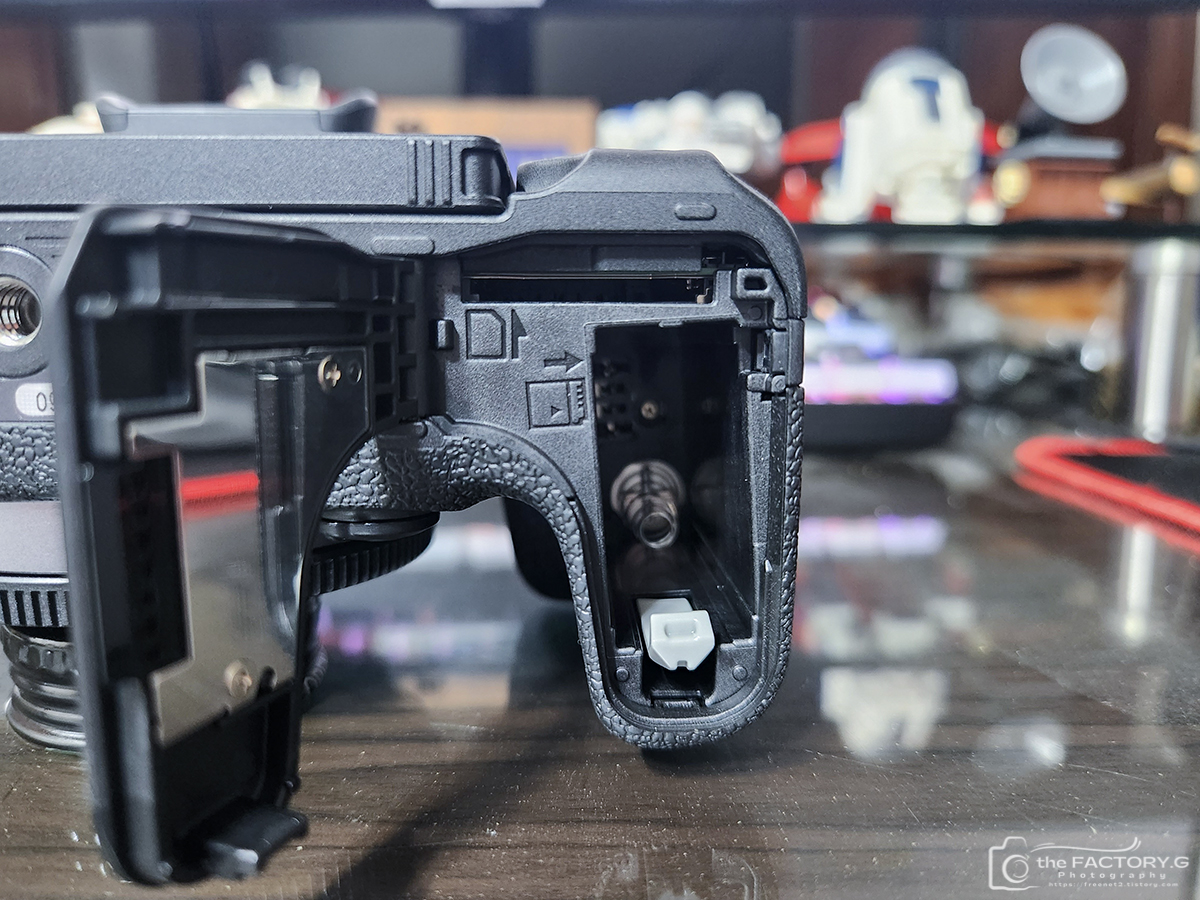 제품 하단에는 삼각대 연결용 소켓과 배터리 및 저장용 SD카드를 위한 소켓이 자리잡고 있습니다.