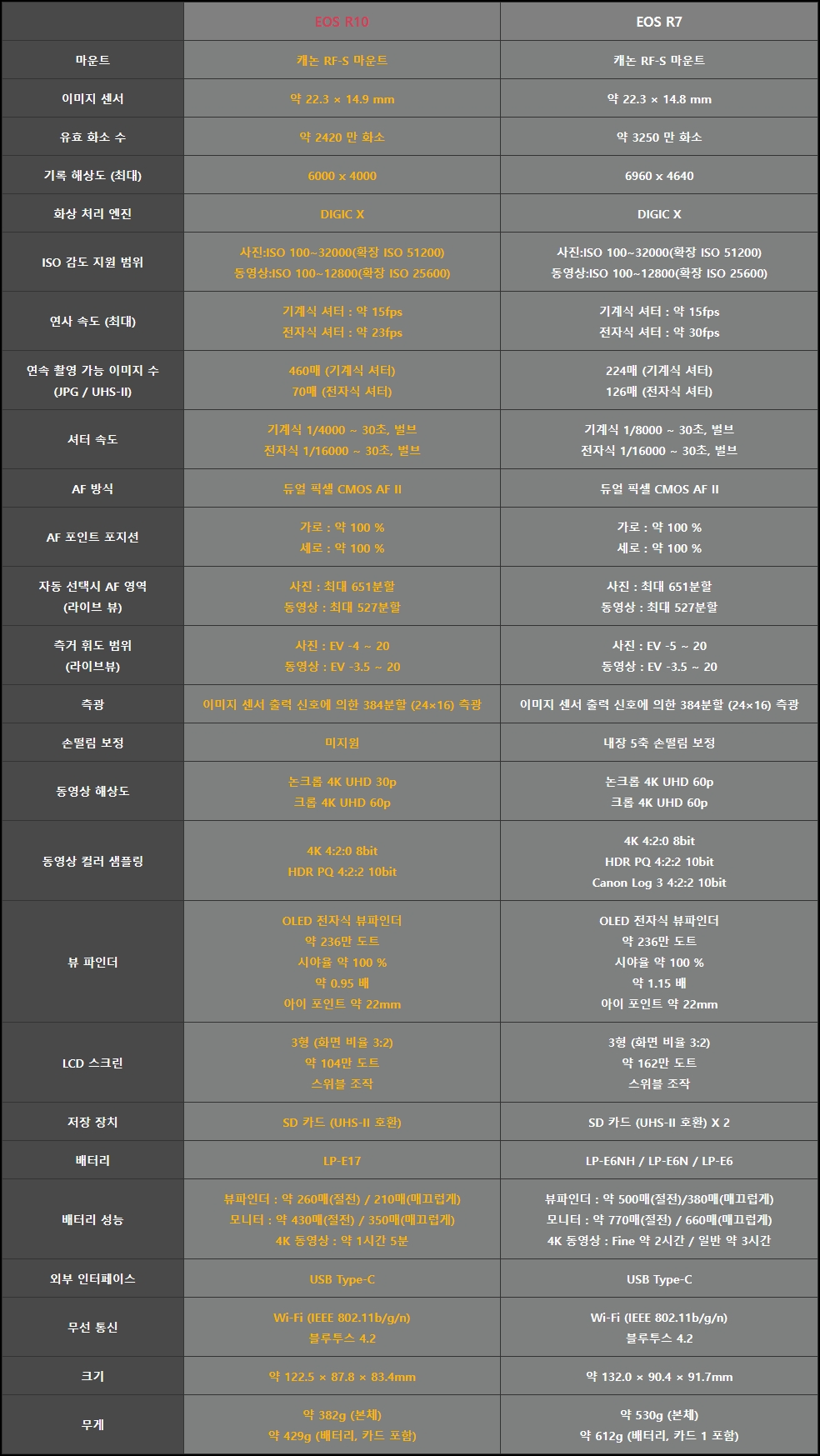 동시기에 출시된 EOS-R7과 대비하더라도 성능적으로 크게 낮거나 부족한 부분이 없으며 캐논이
