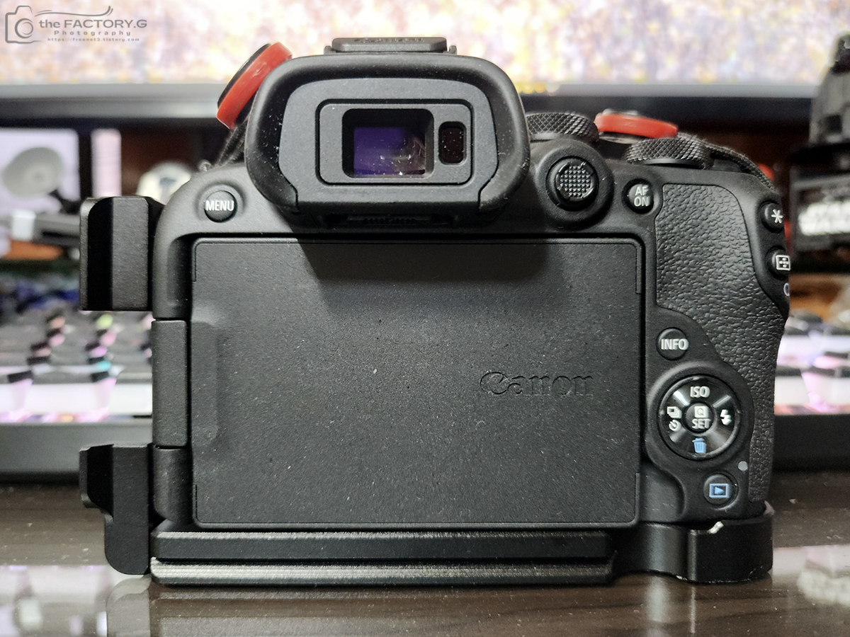 EOS-R10에 장착한 모습입니다. 전면부에는 제조사 로고, 제품명이 새겨져 있고 하단부가 좀 확장되면서