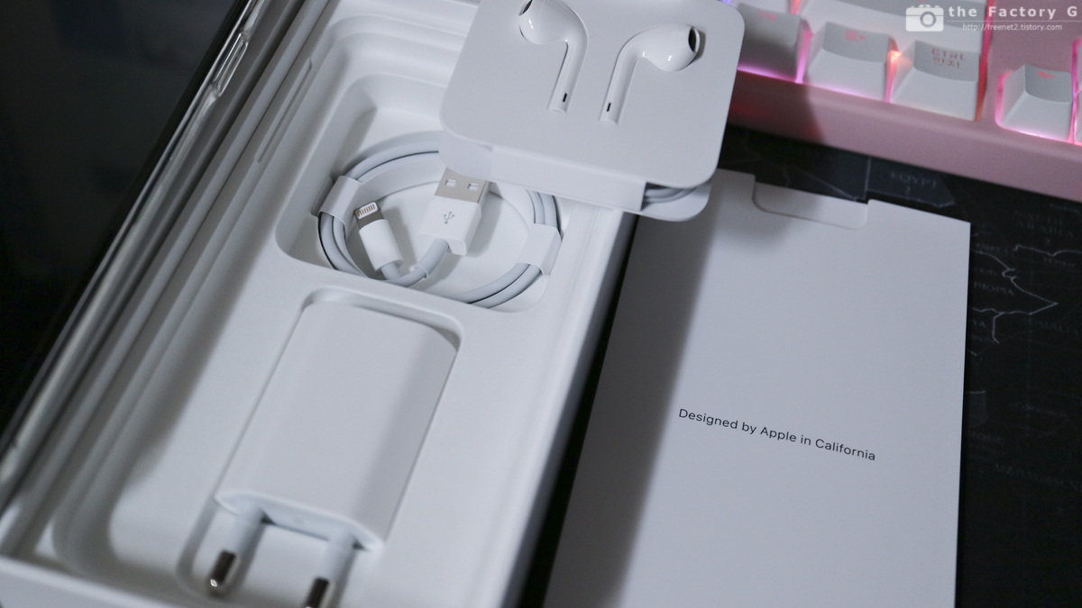 구성품으로는 아이폰 본체 외에 유선 이어폰, 충전기, 라이트닝 케이블, 설명서 및