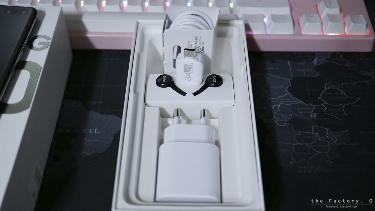 구성품은 전원케이블, 유선 이어폰, USB Type C 변환젠더, 충전어댑터 로 구성되어 있습니다.