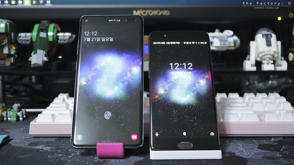 좌측이 갤럭시 S10, 우측이 중국 원플러스사의 원플러스 5 모델입니다. 원플러스 5 모델도