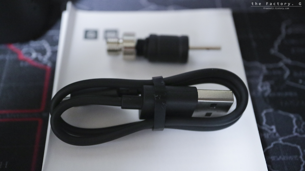 제품 구성품은 설명서, 제품본체, 보관용 파우치, 마이크로 B 타입 충전케이블, 프랑스식 공기압 변환장치,