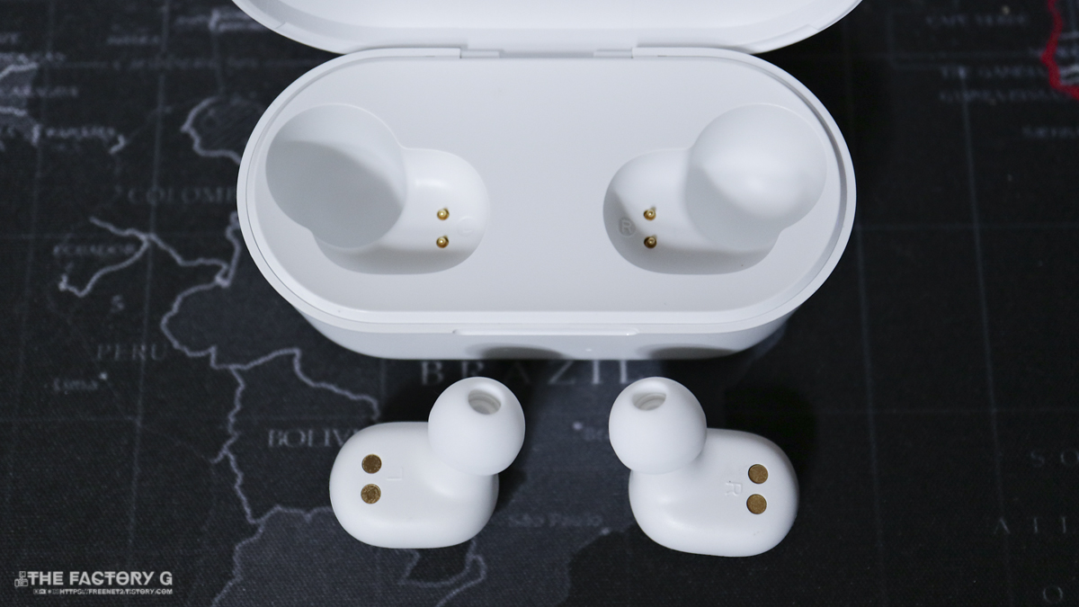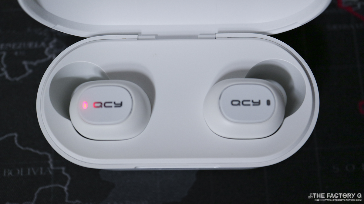 뚜껑을 열면 2개의 무선 이어폰이 보입니다. T1과 동일한 외양이며 마찬가지로 지시등이