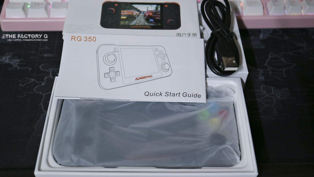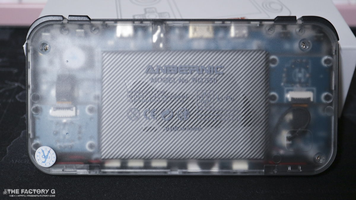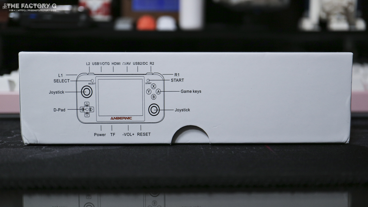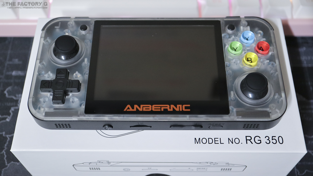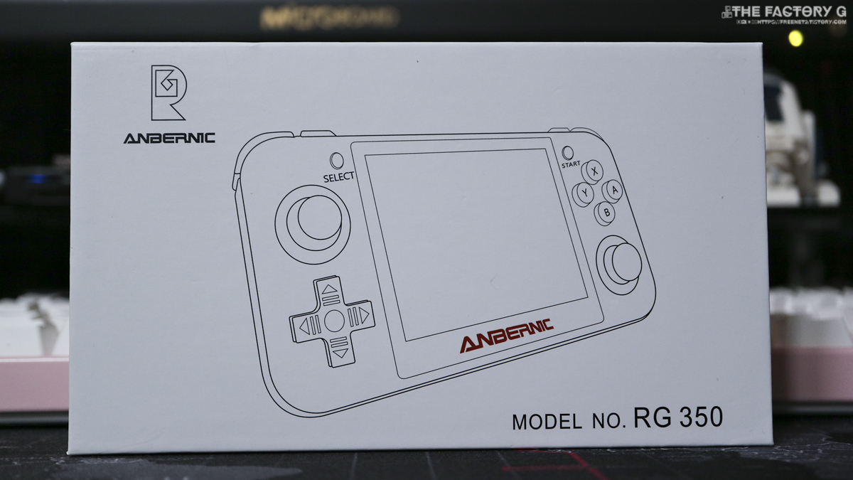 제조사인 ANBERNIC의 로고와 함께 RG350 명칭과 기기의 그림이 전면에 있습니다.