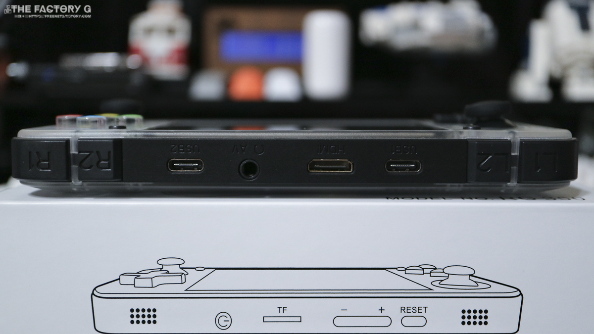 상단에는 R1, R2 버튼 USB-C 2번포트 (충전), 이어폰 단자, 미니 HDMI 포트, USB-C 1번