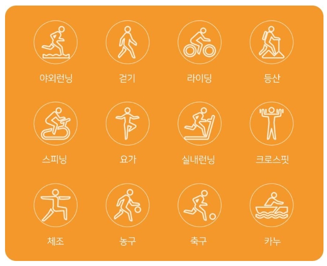 운동모드는 위 그림과 같이 12가지를 지원합니다만 자체 GPS가 없어서 스마트폰 본체의