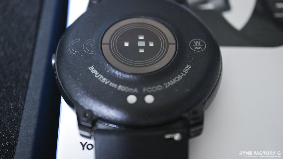 후면 중심에는 심박센서가 하단에는 충전단자가 자리잡고 있습니다.