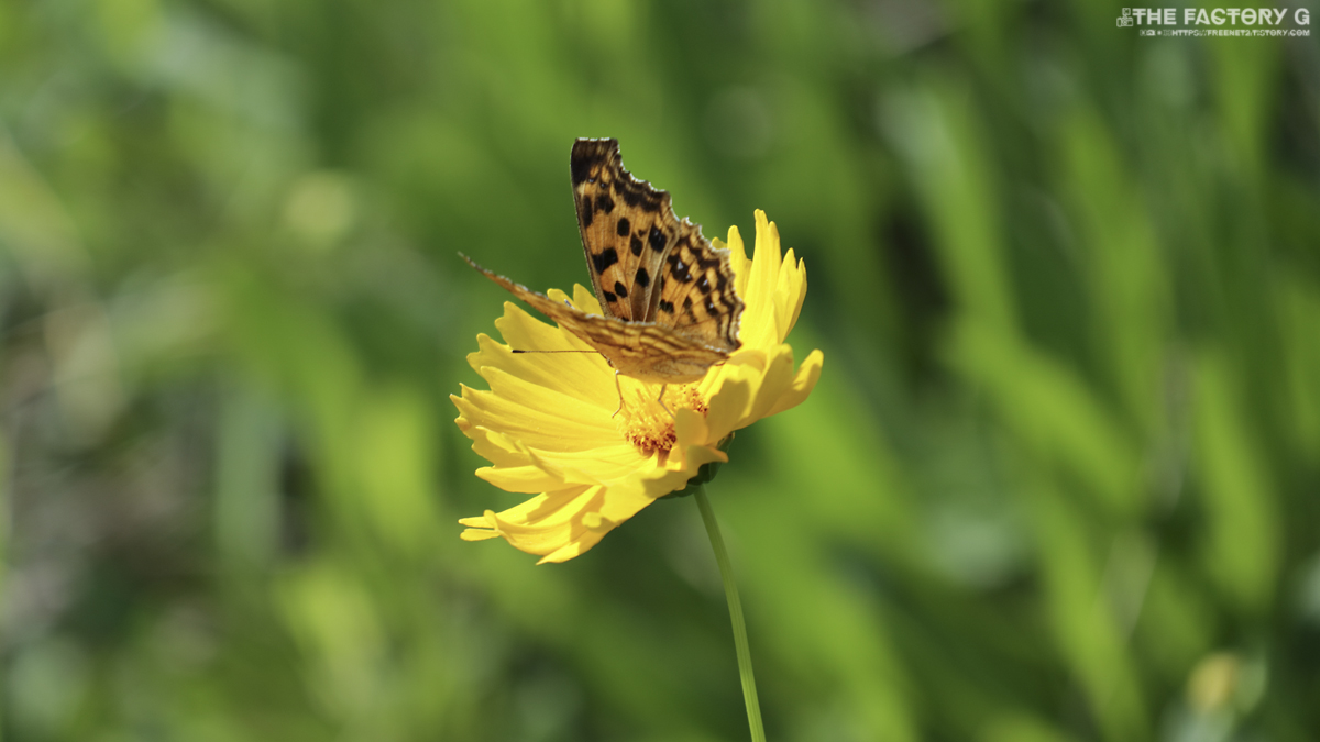 노랑 황화코스모스에 나방이 내려앉아 늦여름의 먹이활동을 합니다.