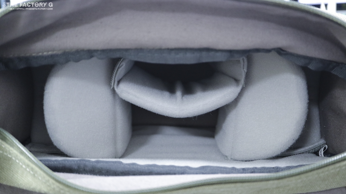 탈부착이 가능한 파티션으로 구분된 메인 수납공간은 표준렌즈를 장착한 DSLR과 렌즈 1개