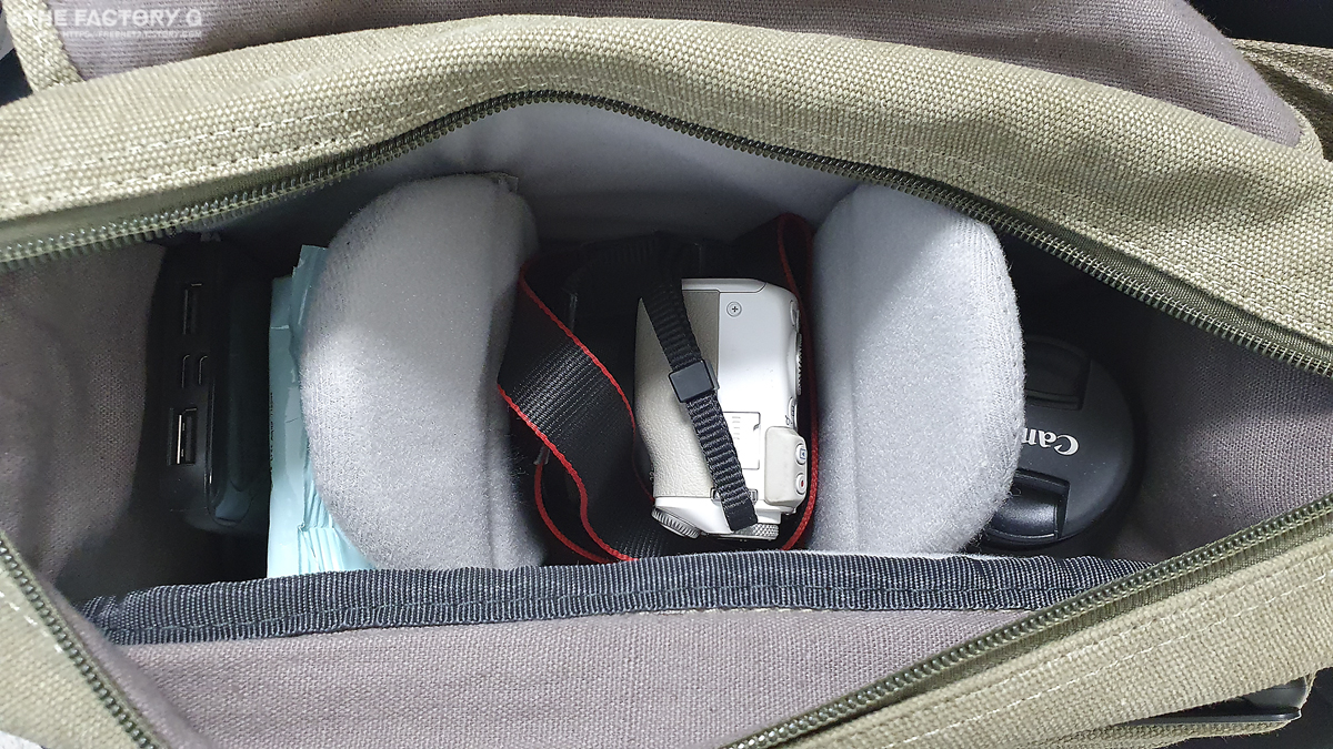 제가 주로 챙기는 캐논 EOS-M3와 28mm 매크로 렌즈, 18-150 렌즈 하나 수납하고 남는 공간에