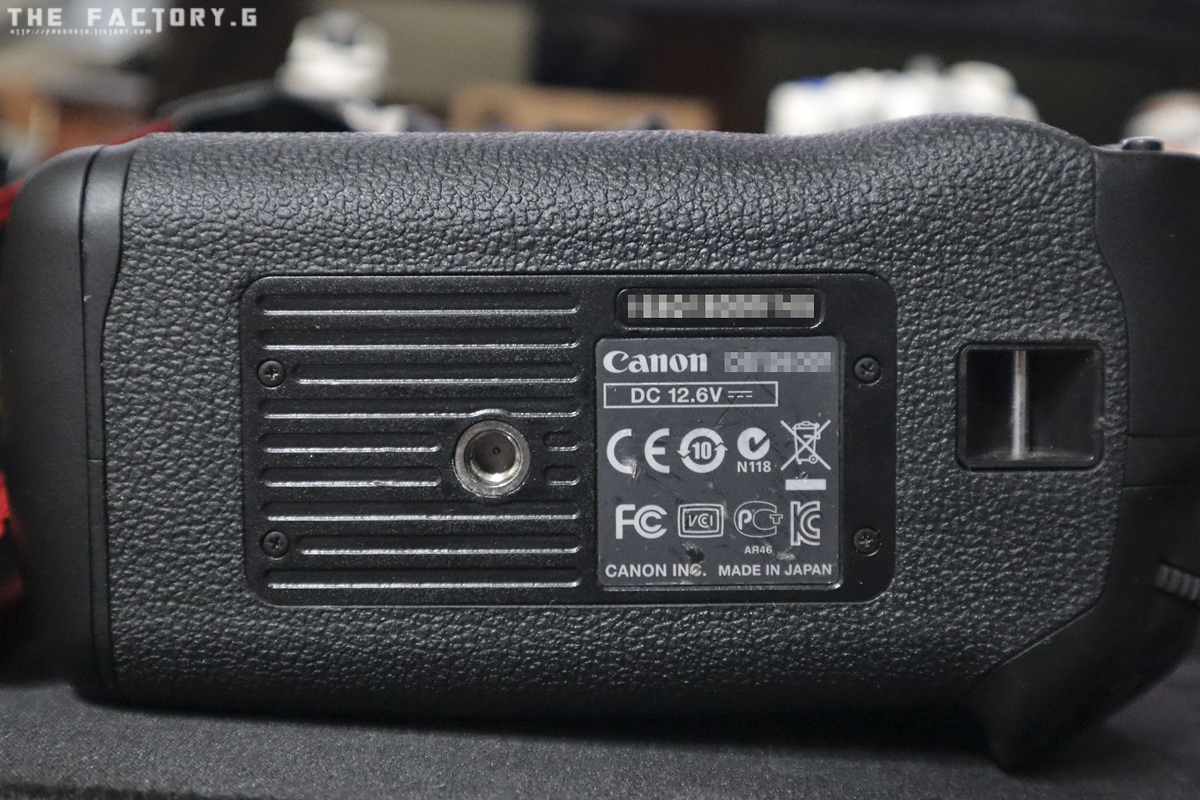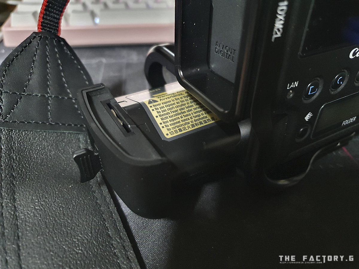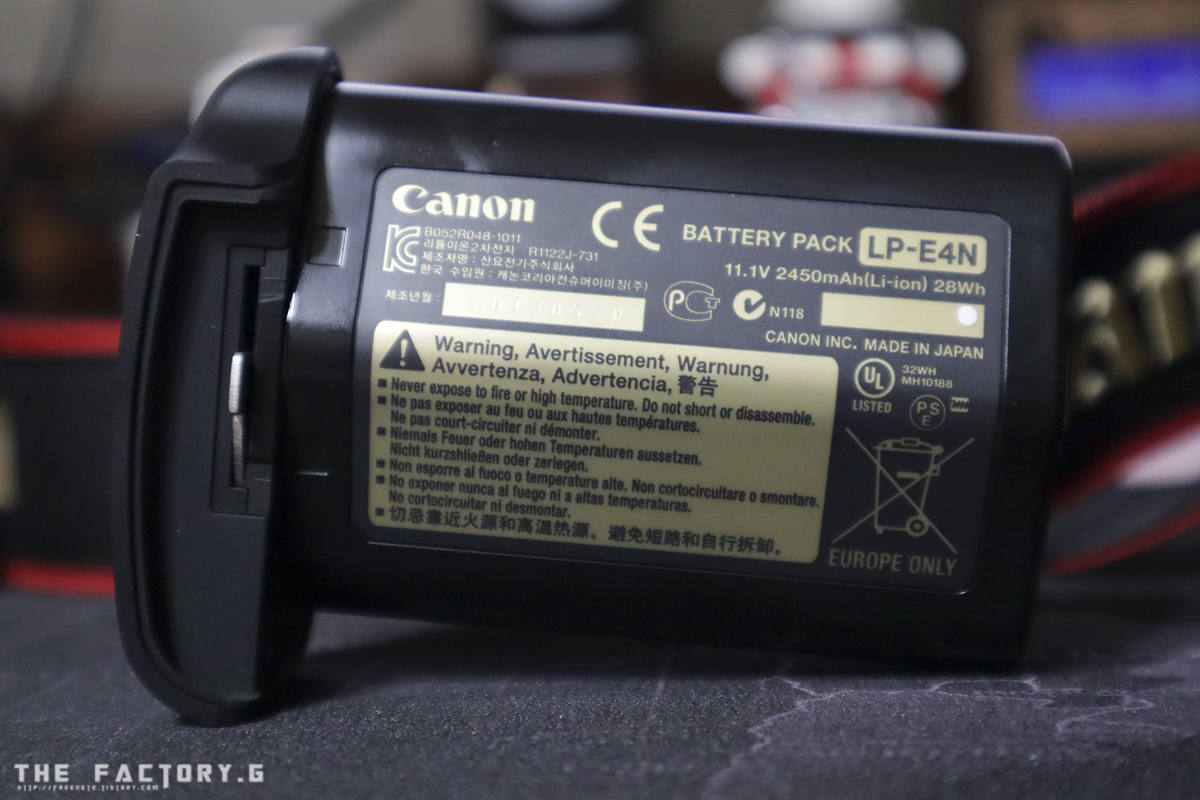 배터리는 좌측 하단에 장착하며 전용의 LP-E4N 배터리를 사용합니다. 배터리는