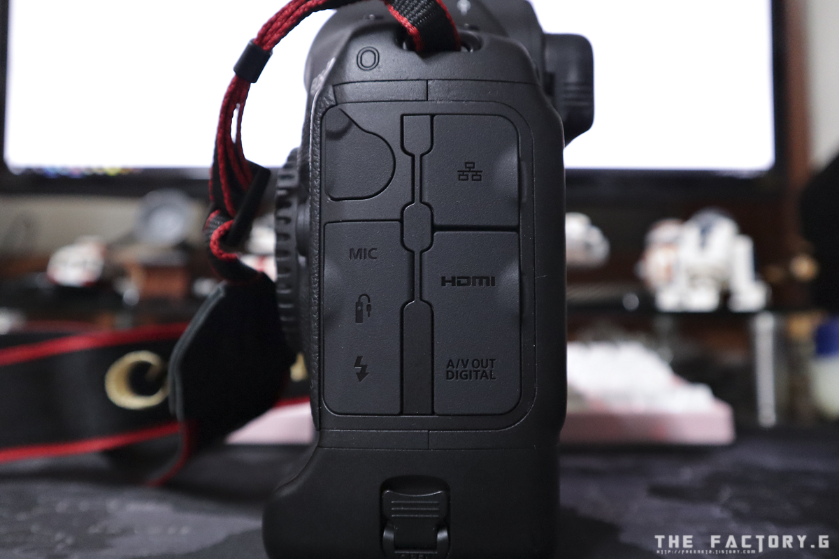 좌측면에는 확장시스템단자, 마이크, 리모컨, 외장플래쉬 단자와 랜포트 HDMI와
