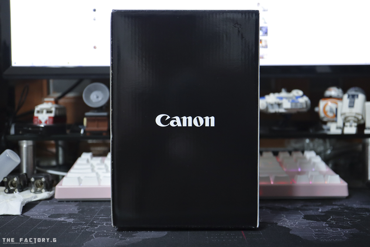 캐논 특유의 검정 바탕에 백색 캐논 로고가 있는 전형적인 캐논의 포장박스입니다.