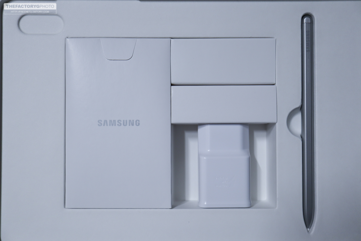 가운데에는 충전기와 충전케이블, S펜이 각각 자리잡고 있습니다.