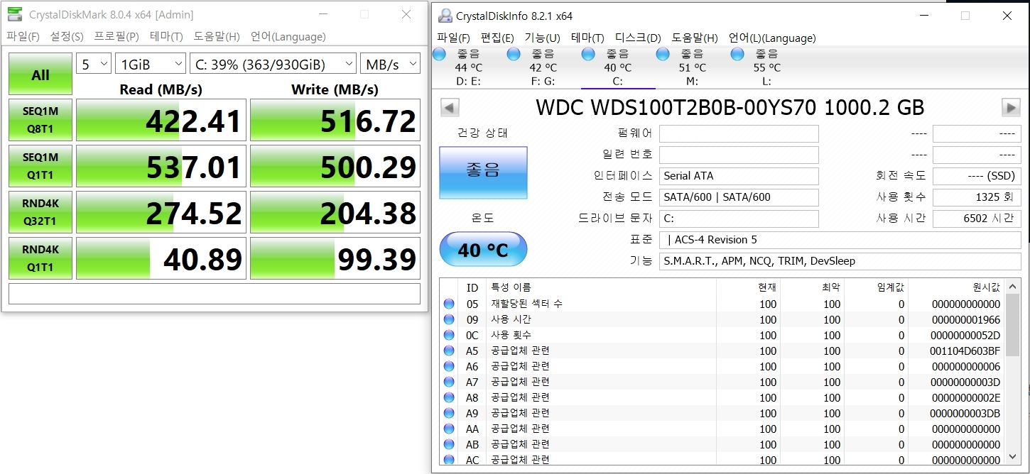 WD BLUE 1TB 제품이었습니다. NVMe 플랫폼이지만 SATA 방식으로 500MB대 입출력