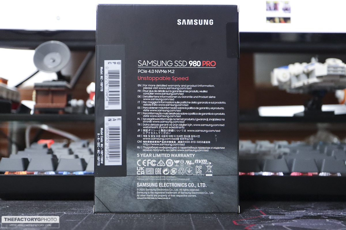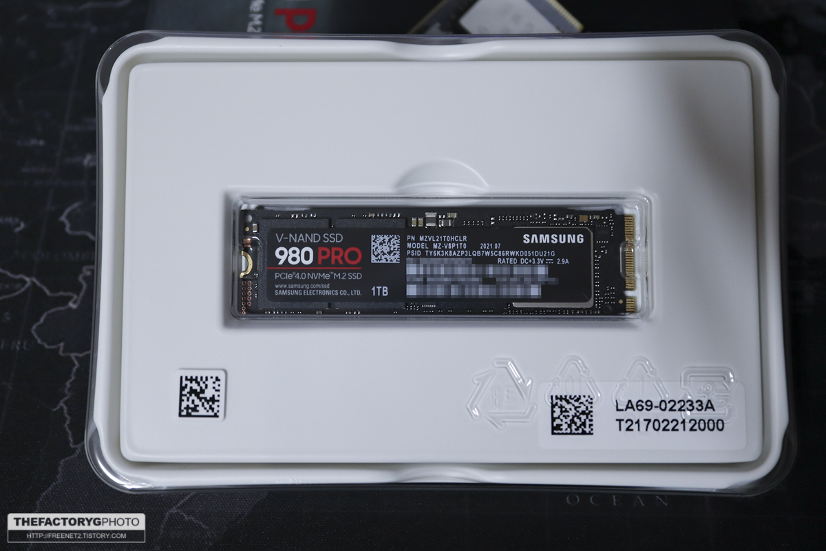 포장박스 전면입니다. 제품 이미지와 삼성 로고, 제품명, 용량과 우측 하단에 PCIe 4.0의 최대
