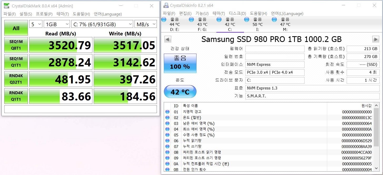 이번에 새로 장착한 980PRO의 크리스탈 디스크마크의 정보입니다. PCIe 3.0의 입출력 속도를