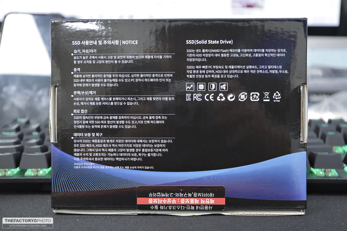후면에는 사용지 주의사항과 SSD에 대한 정보, 제품 인증정보 등이 기재되어있습니다.