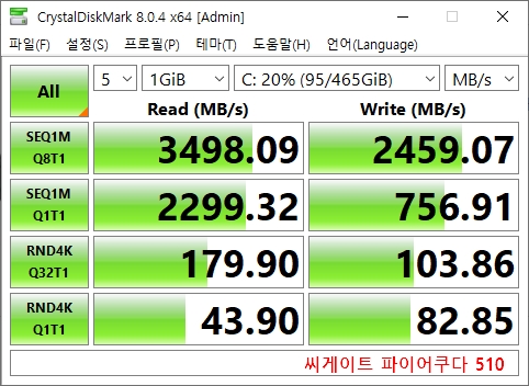 회사 PC 메인으로 사용하는 씨게이트 파이어쿠다 510입니다. NVMe PCIe 3.0이어서 읽기/쓰기