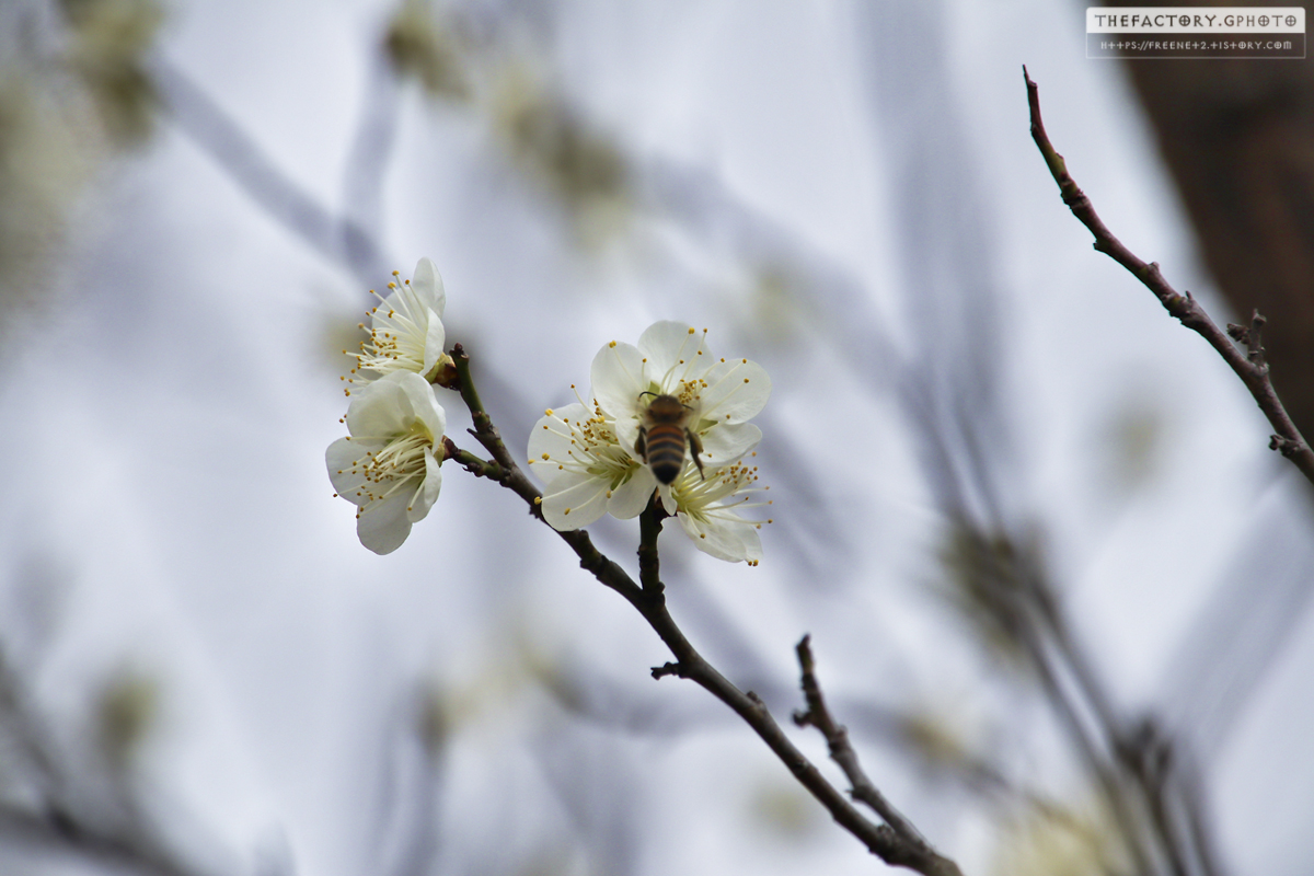 아직 만개하지는 않았네요. 그래고 피어난 매화꽃 사이로 벌들이 바쁘게 움직입니다.