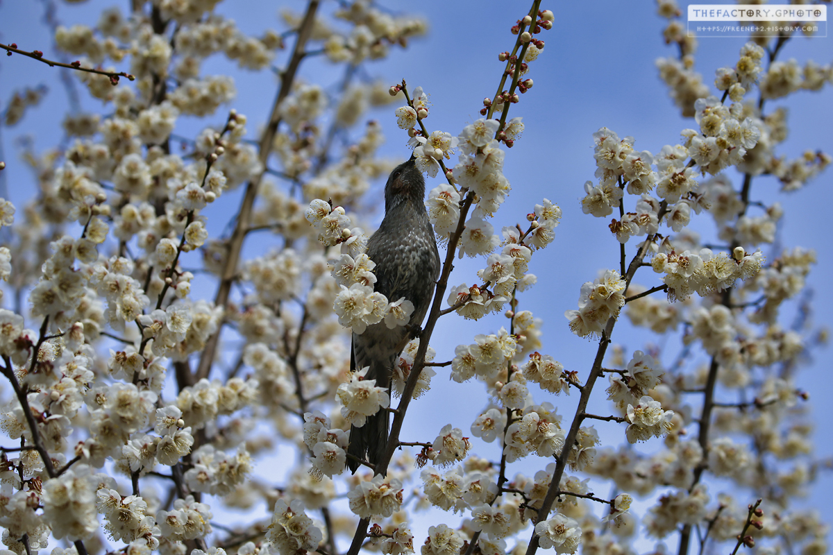 하얀 매화꽃 사이로 새들이 바삐 날며 봄날의 기운을 만끽합니다.