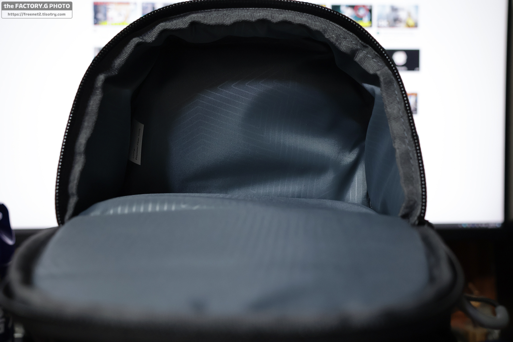메인포켓은 지퍼를 열어 사진과 같이 개방할 수 있습니다. 내부에는 세로그립이 없는 미러리스 또는 DSLR