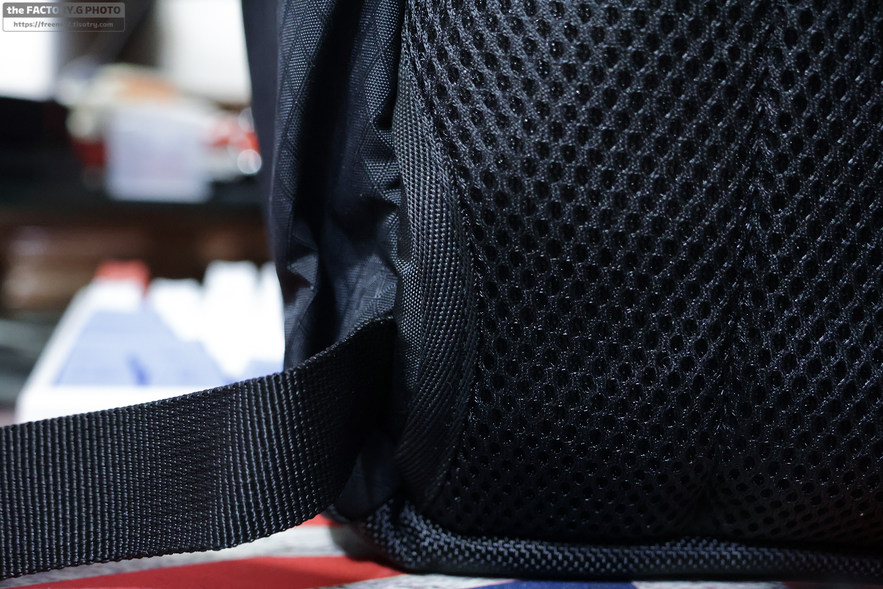 슬링백이나 숄더백으로 멜 수 있는 메인 스트랩이 있고 몸에 닿는 뒷부분은 메쉬처리가 되어있어 습기나 땀이